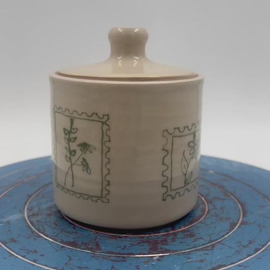 this is a small handmade ceramic jar meant for sugar, spices or coffee, with a little notch in the lid for a spoon. i painted a pattern of postal-stamp shapes around the outside, each filled with simple flower designs, all done in an olive-green underglaze. it’s a sweet, functional piece with a bit of a storybook feel.