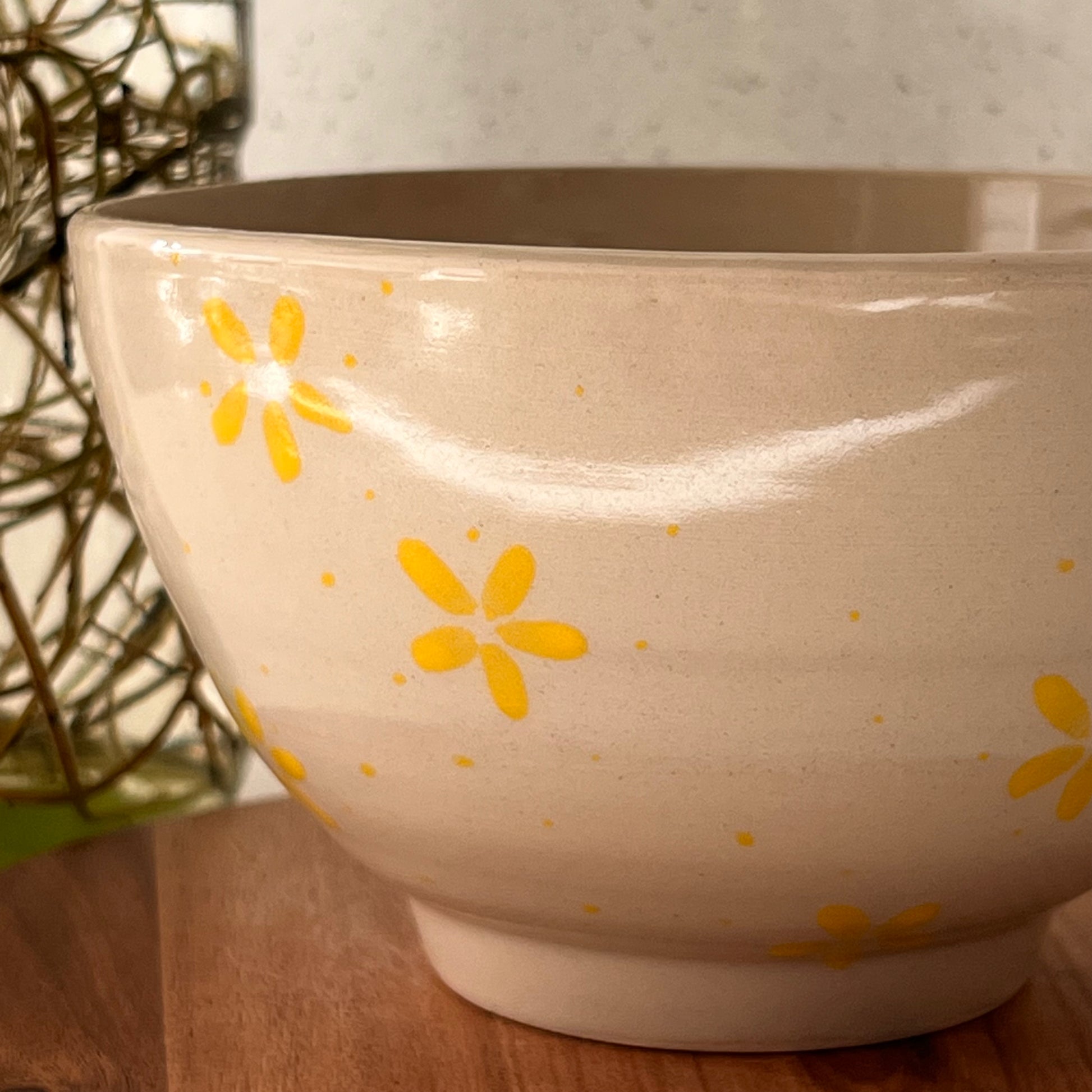 the wonky bowl has this gently imperfect shape that gives it so much charm. it’s cereal-sized, with three dents around the outside that make it not-quite-round in a cozy, organic way. the outside is painted with delicate blossoms and tiny dots, and this one features a nice golden yellow. this bowl is a little quirky, a little sweet, and very happy to join you for breakfast.